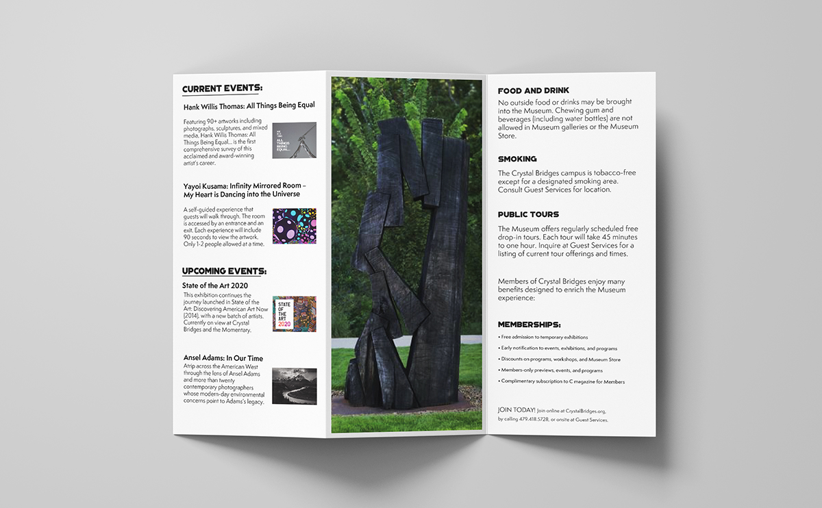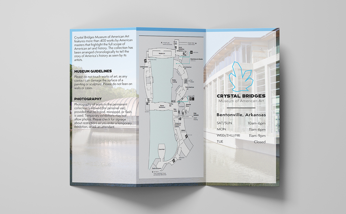 According to the American academy of Arts and Sciences, “the largest declines in museum visitation rates occurred among younger Americans (ages 18-44)”. With the rebranding of Crystal Bridges logo and signage they will have a more vibrant logo and intriguing signage that keeps the consumers engaged. The softer colors and interactive logo will also make the museum more approachable and not give of a “snooty” high class feel to irregular museum goers. The sleek yet eye-catching designs will give the museum a more family friendly feel and draw in the younger demographics thus increasing the knowledge and enjoyment of its cliental.
